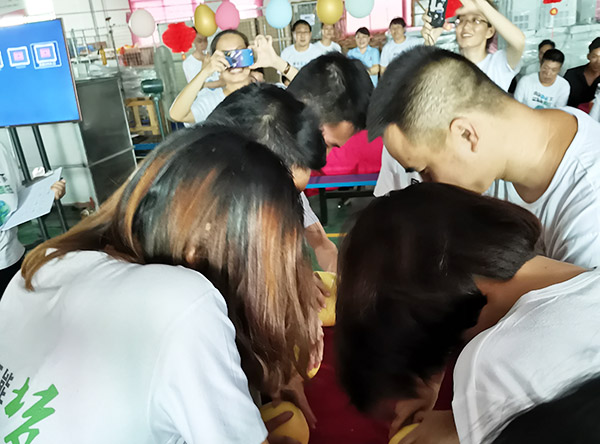 在这温馨的时刻,多种精彩的游戏也开始轮番上演,广大员工热情高涨,积极参与。一开始便是“徒手剥柚子”,大伙们兴致冲冲,徒手上阵,不到一分钟的时间,就有选手率先完成,现场呐喊声不断。在男女齐上阵的“光盘拔河”耐力赛中,大伙们都使出了浑身解数,各种搞怪表情包频出。“你划我猜”环节,更是现场上演智商与默契的PK大战,各种花式动作、幽默言语让现场更加沸腾,欢呼声不断,大家都乐在其中,洋溢着幸福的笑容。